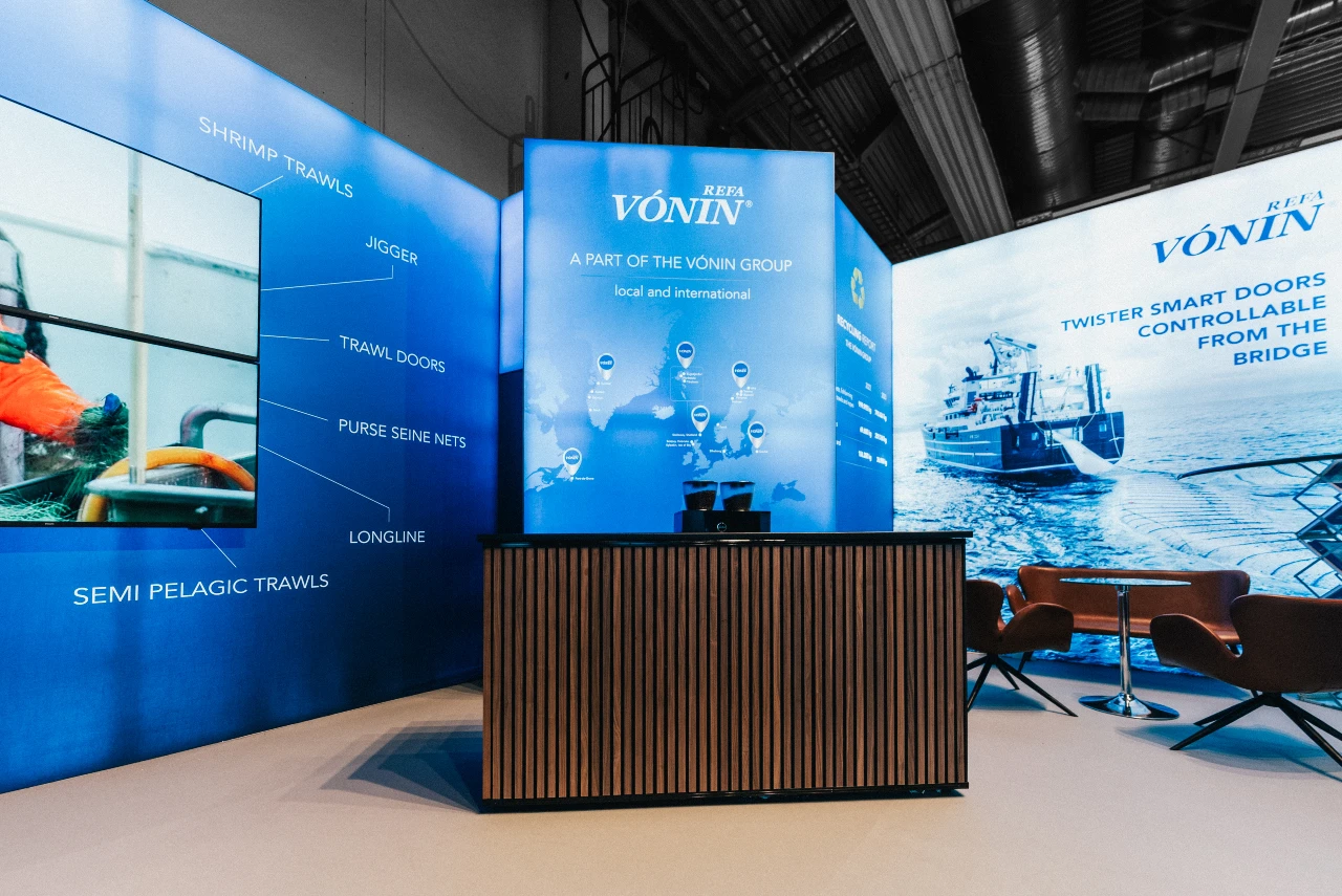 Vónin udvikler og producerer fiske- og opdrætsudstyr af høj kvalitet, tilpasset udfordrende maritime forhold. De leverer innovative løsninger til fiskeri- og havbrugssektoren internationalt. Vónin er en trofast kunde, som vi gennem flere år har bygget stande til på forskellige messer rundt omkring i Europa. Denne gang ønskede de en stand, der både var iøjnefaldende og økonomisk bæredygtig, med mulighed for genbrug på flere arrangementer i løbet af 2024.